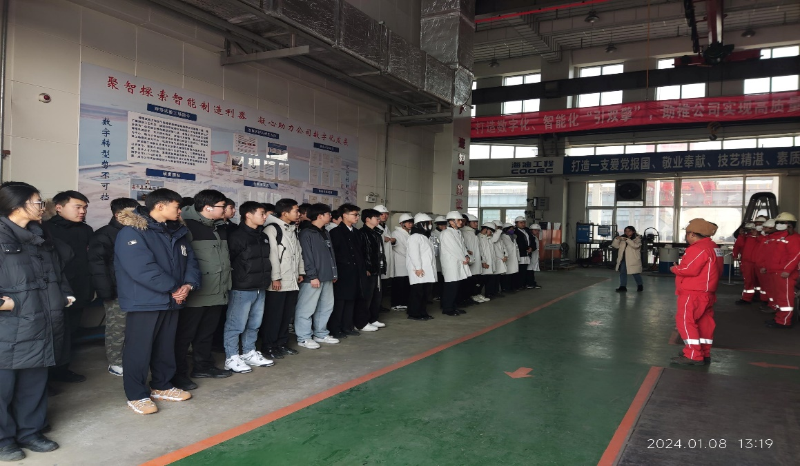 为充分发挥龙头企业在人才培养中的作用,深化教学改革,推动教学方式创新,提升海洋工程装备技术专业学生对岗位的认识程度和学习兴趣,2024年1月8日下午,海洋装备系副主任徐燕铭、辅导员安佳佳一行带领海洋工程装备技术2023级35名学生前往海洋石油工程股份有限公司天津智能制造分公司,展开实地参观学习。
