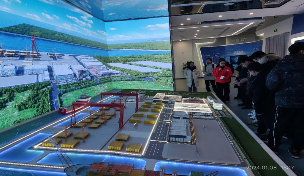 参观结束,同学们来到智能化制造基地蓝图展厅,近距离感受中国海洋石油工业的蓬勃发展,国家级技能大师刘海林亲自为同学们传授知识。手掌轻触,一座科技感十足的大门徐徐开启,同学们在感叹中开启了海洋石油“智慧之旅”,通过智能化沙盘、智能制造流程演示和海洋工程“设计、采办、建造、安装、项目管理”全业务链环节沉浸式体验,同学们深刻领略“自动化生产、数字化赋能、绿色化发展、产业链协同”的智能制造示范基地。