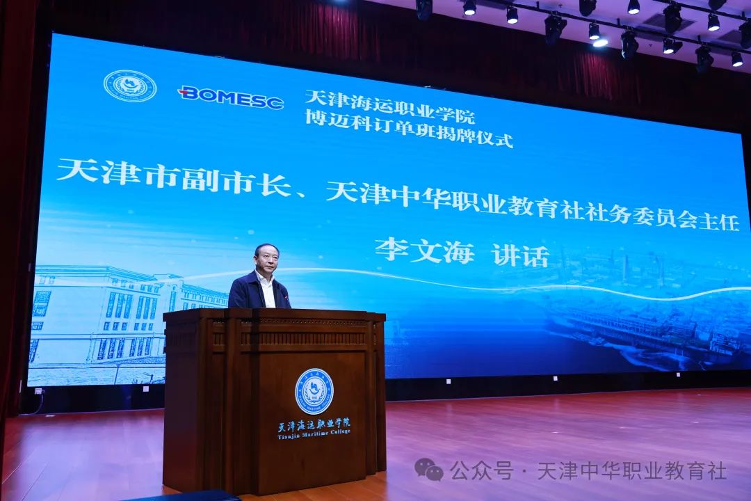 由天津中华职业教育社、天津市教育委员会和天津市人力资源和社会保障局共同主办,天津海运职业学院和博迈科海洋工程股份有限公司承办的博迈科订单班揭牌仪式于10月26日在天津海运职业学院隆重举行。天津市副市长、天津中华职业教育社社务委员会主任李文海出席揭牌仪式并讲话。