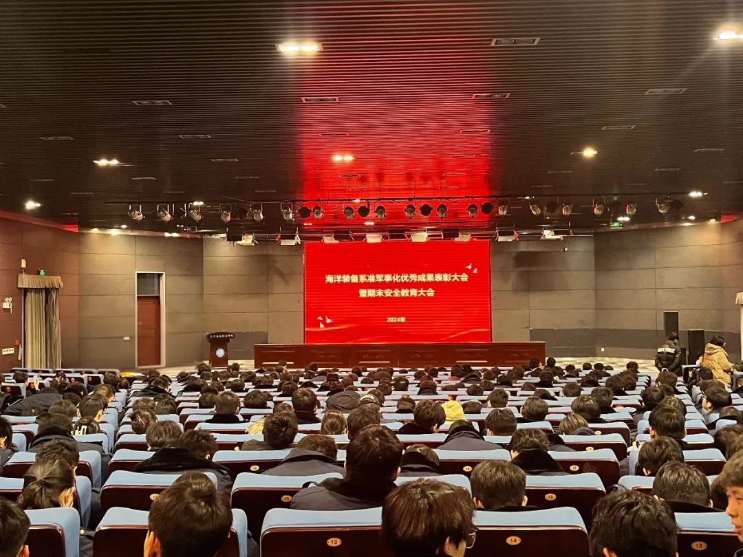 会议分为准军事化优秀成果表彰和安全教育两个部分。颁奖仪式在雄壮的国歌声中拉开帷幕。主持人宣读了“海洋装备系关于表彰2024-2025学年第一学期优秀个人、优秀宿舍、优秀中队和最美志愿者的决定”,随后,由系部领导和辅导员教师代表为各项荣誉获得者颁发了证书和奖品。